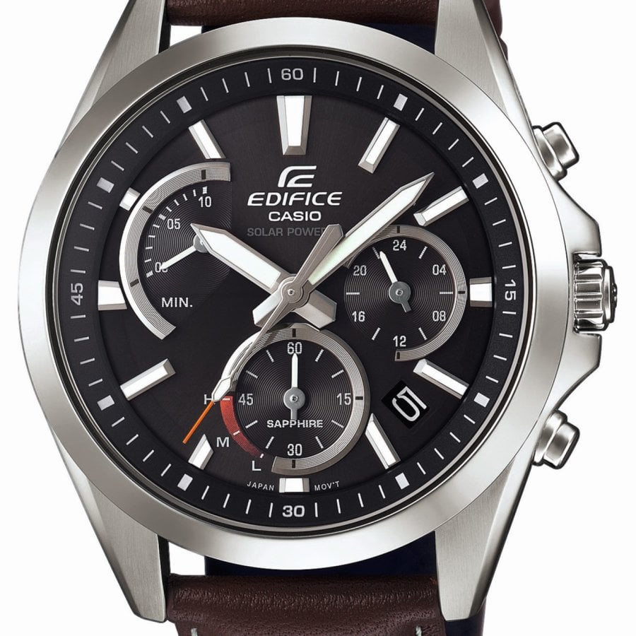 Relógio EDIFICE de homem, solar, com vidro de safira, caixa em aço inoxidável e bracelete em pele.