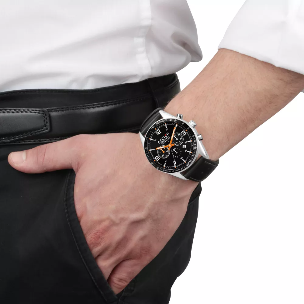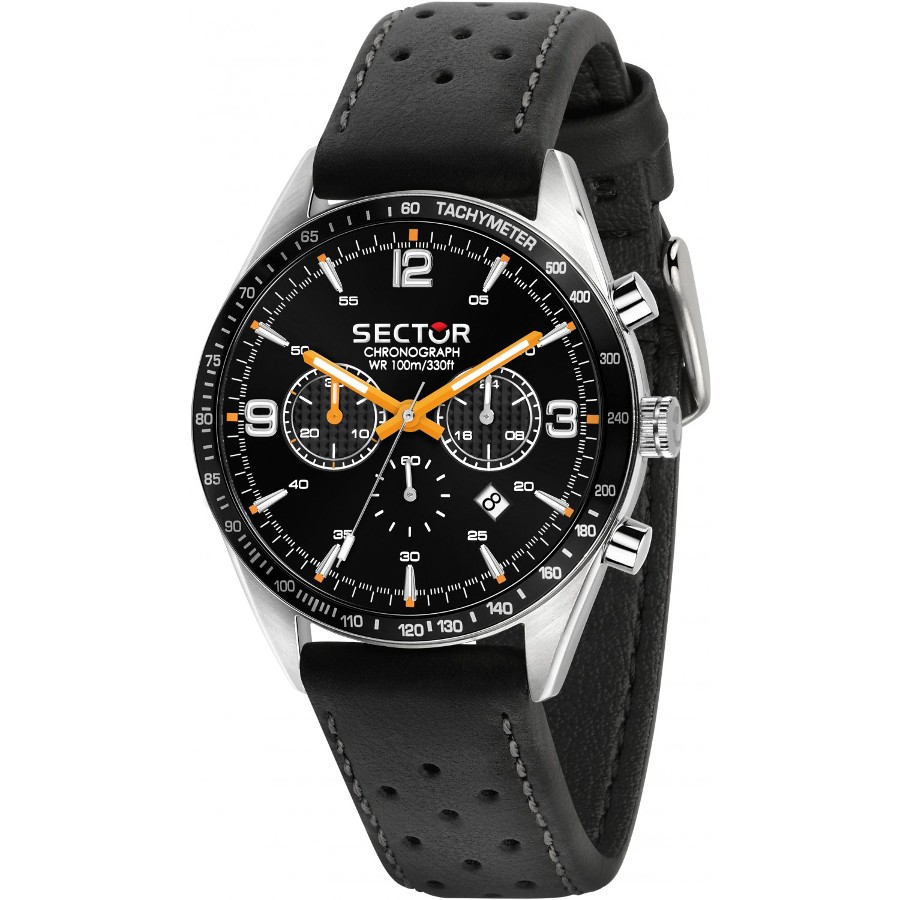 Relógio Sector 770, R3271616001, de homem, cronógrafo, com caixa em aço e bracelete em pele preta.