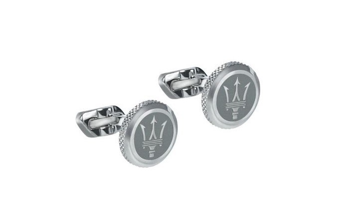 Botões de punho em aço com símbolo "Tridente" da marca Maserati.