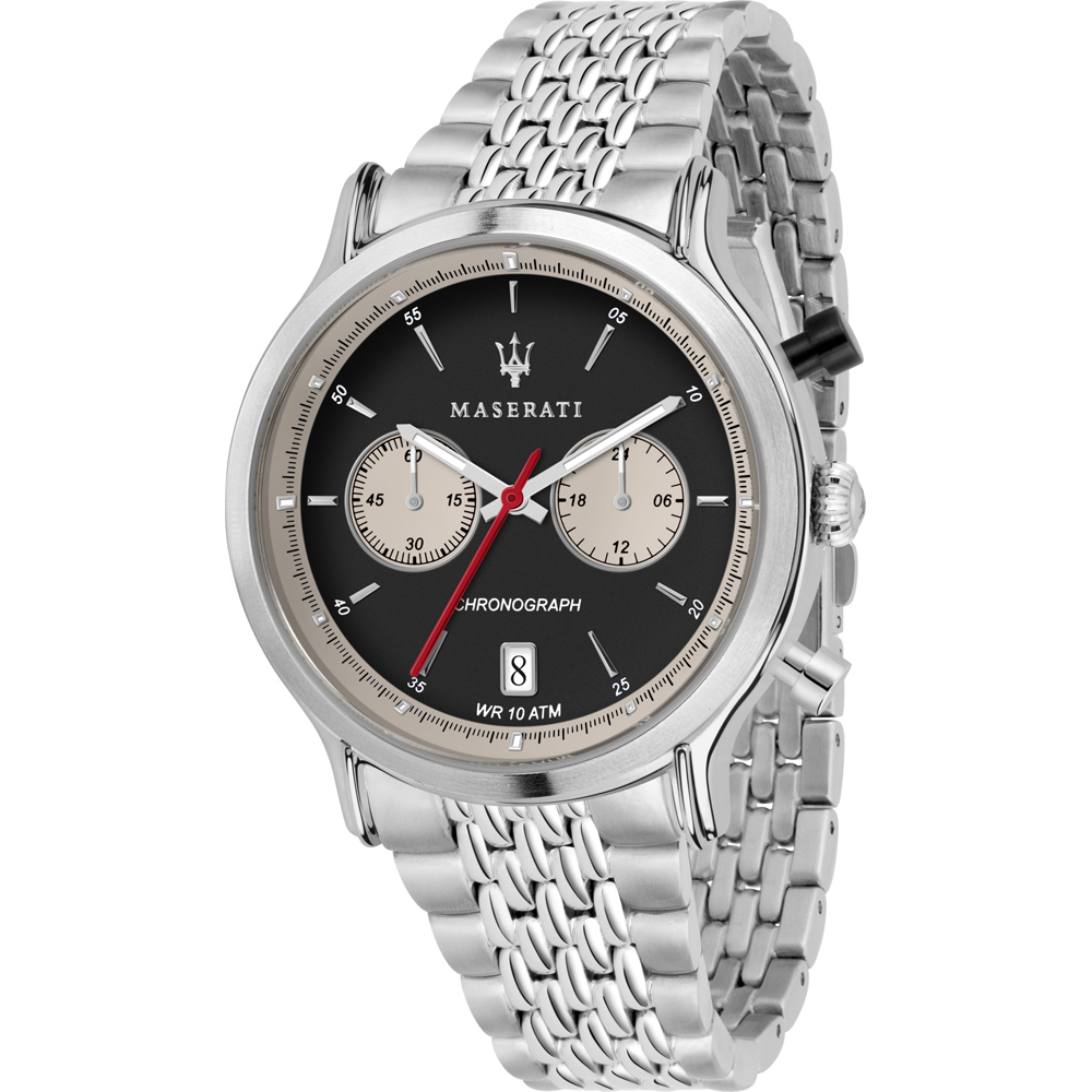 Relógio Maserati Legend com caixa em aço inoxidável e equipado com uma bracelete de metal.