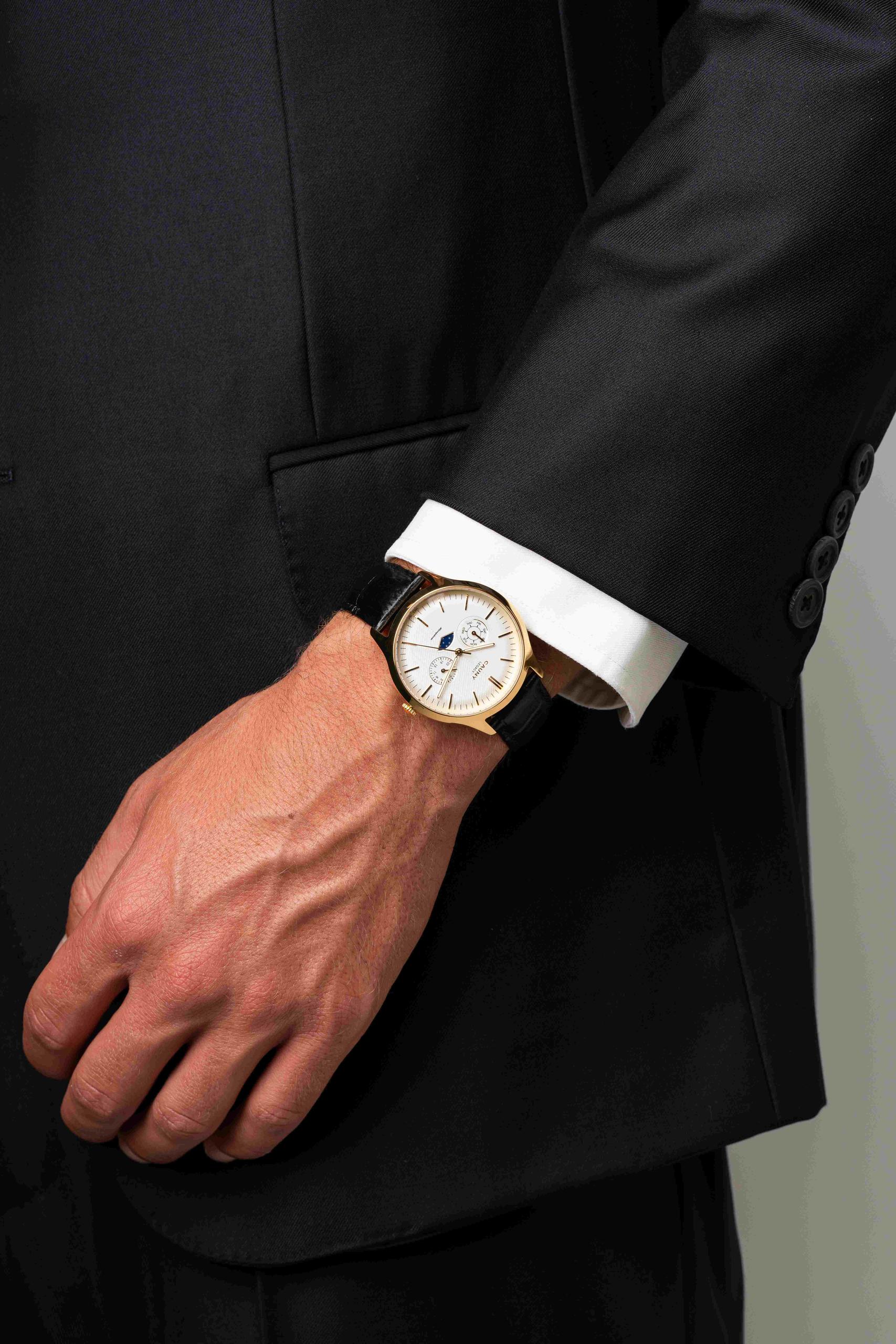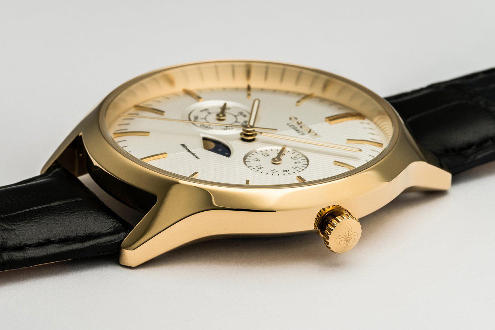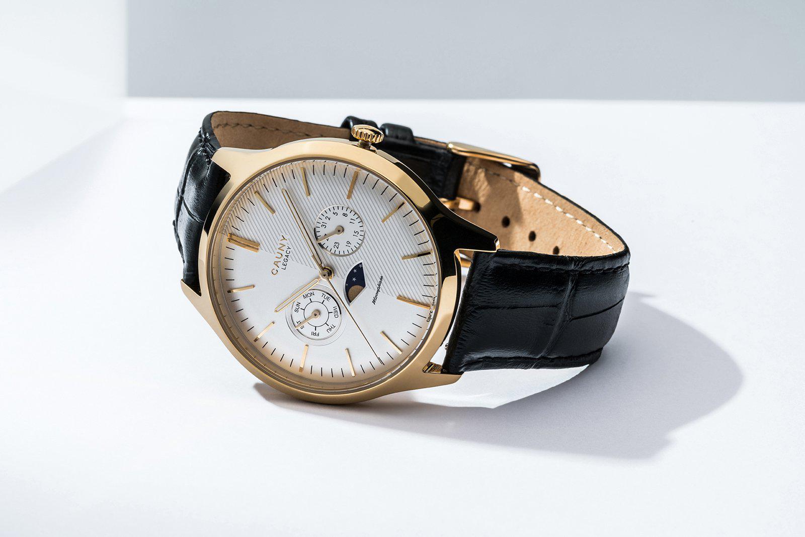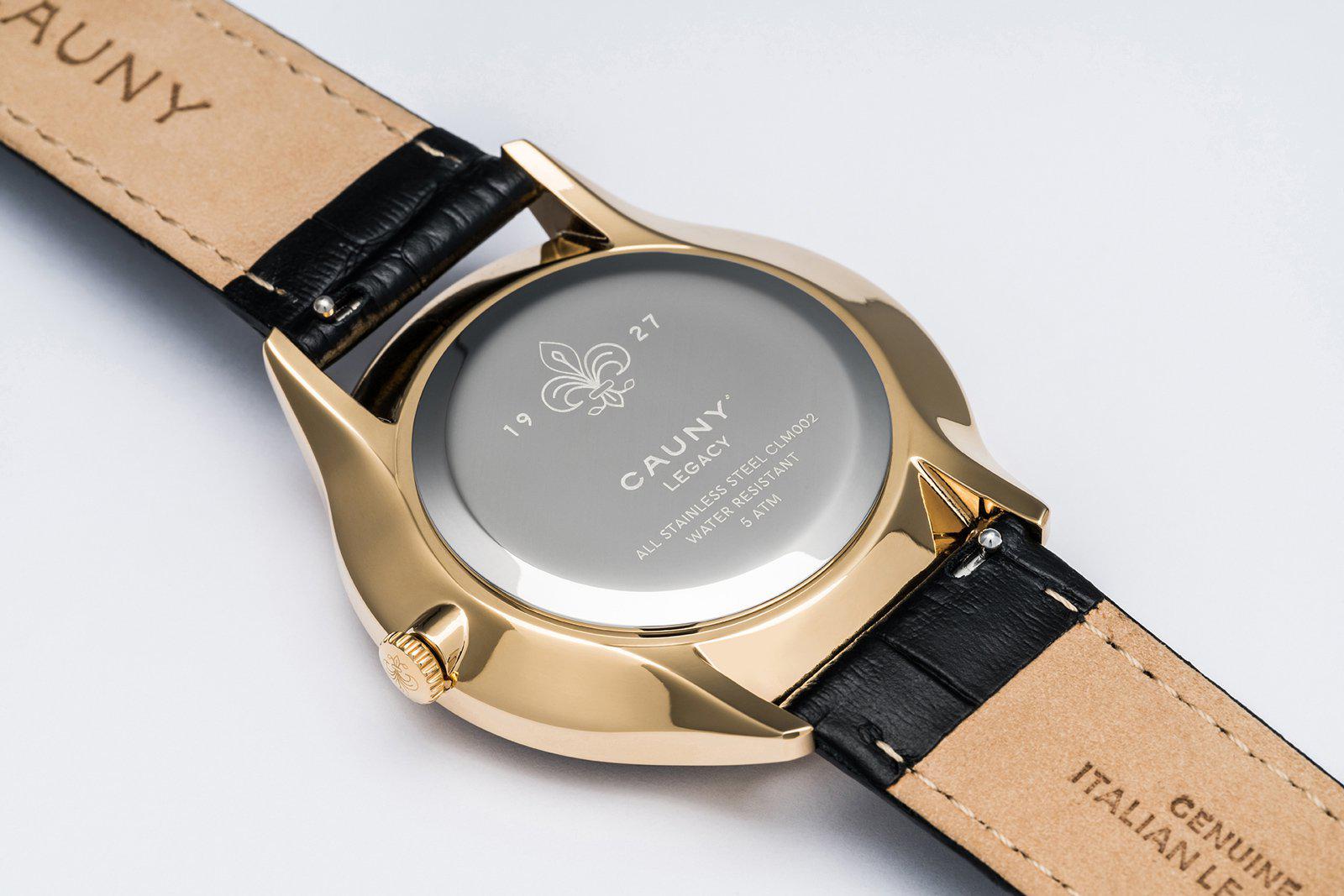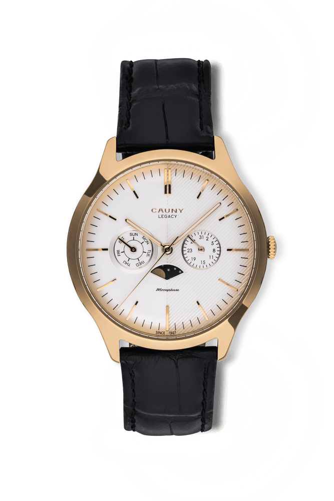 Relógio Cauny Legacy Moon-Phase Gold em aço inoxidável com bracelete em pele intercambiável.
