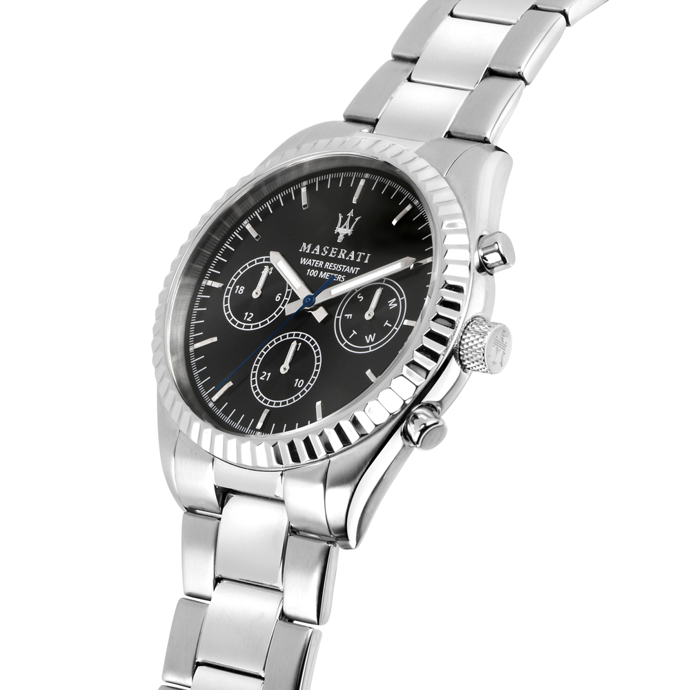 Relógio Maserati Competizione em aço inoxidável equipado com uma bracelete de metal.