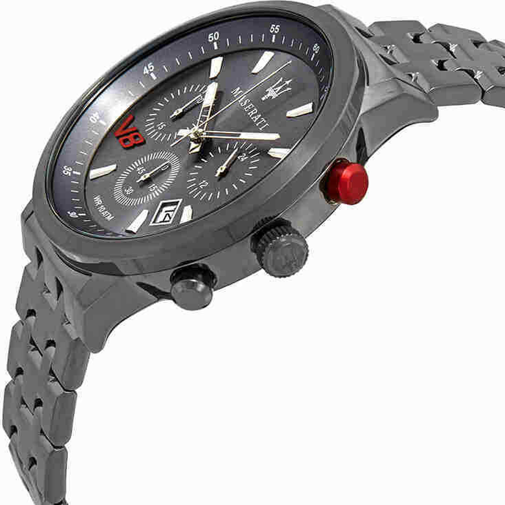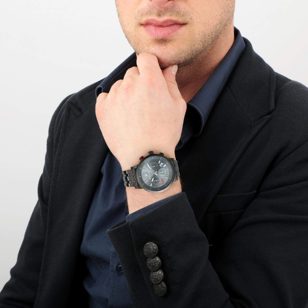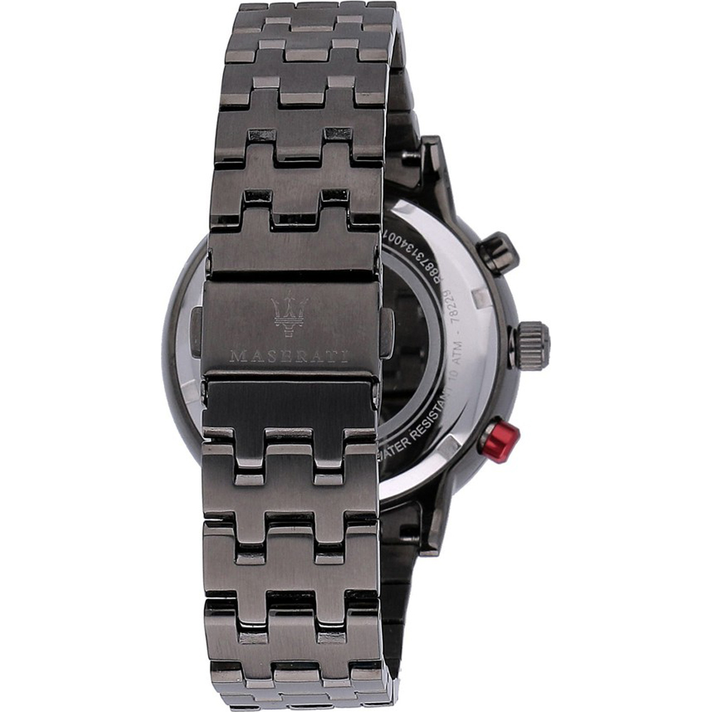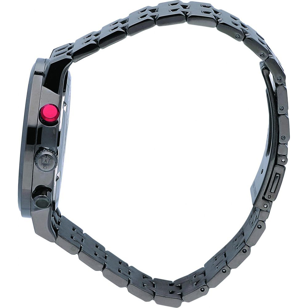 Relógio Maserati Granturismo com caixa em aço inoxidável revestido a cor e equipado com uma bracelete de metal.