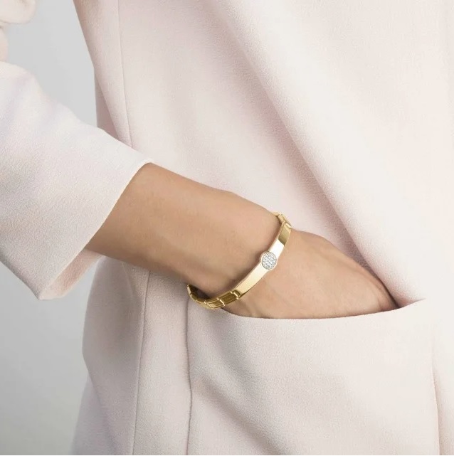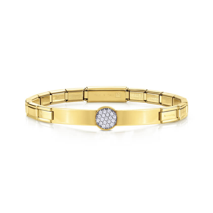 Pulseira com um centro de zircónias em aço inoxidável, com acabamento em PVD ouro amarelo. Comprimento: 18 cm. O presente perfeito para o dia da mãe.