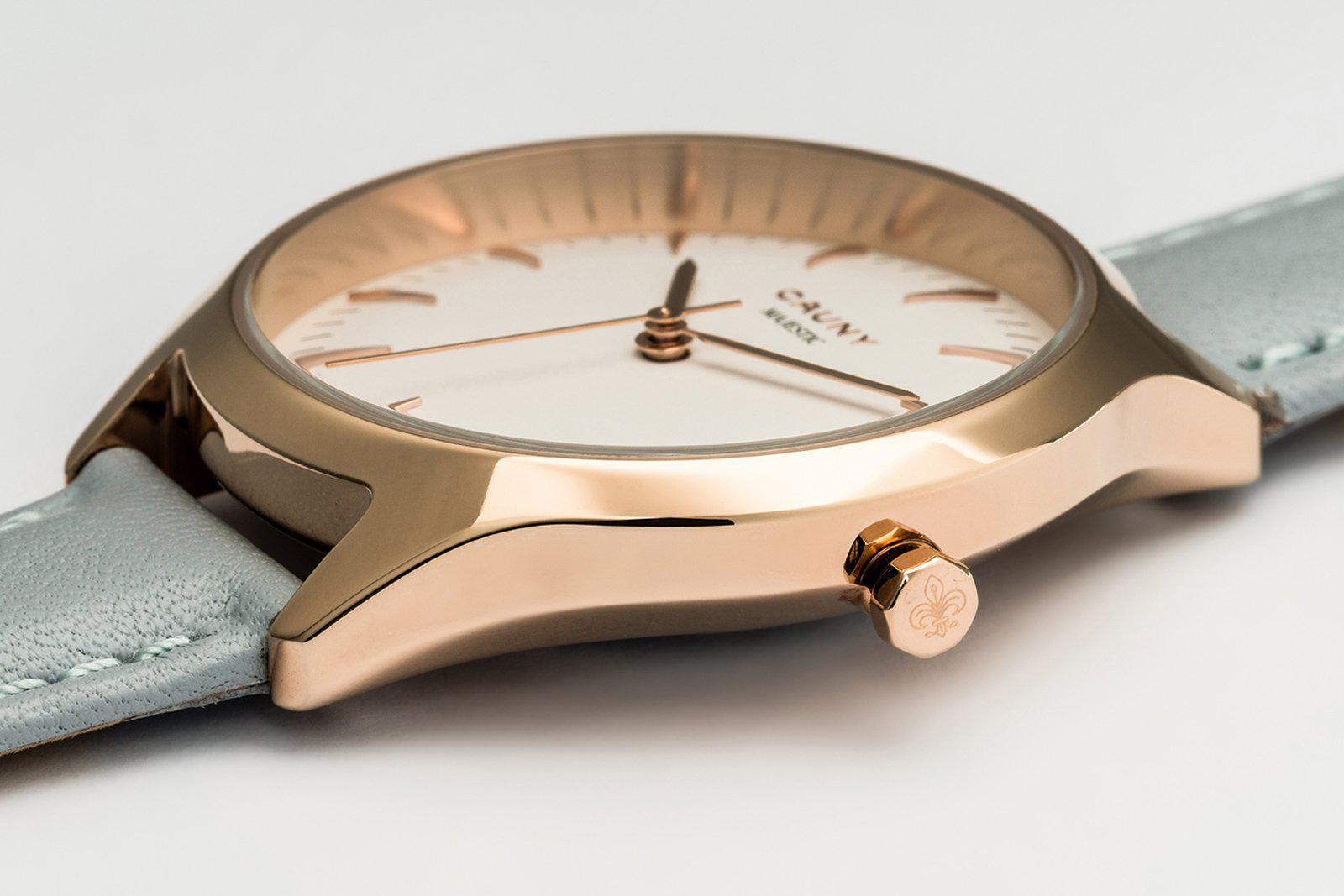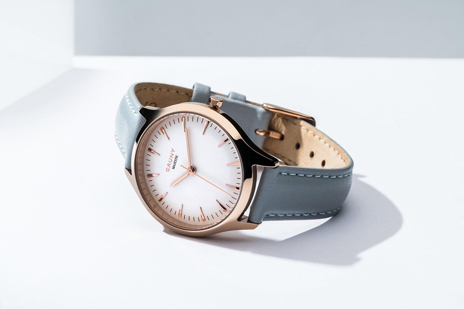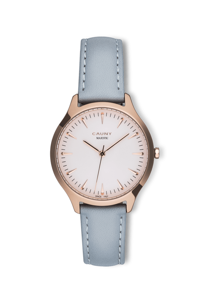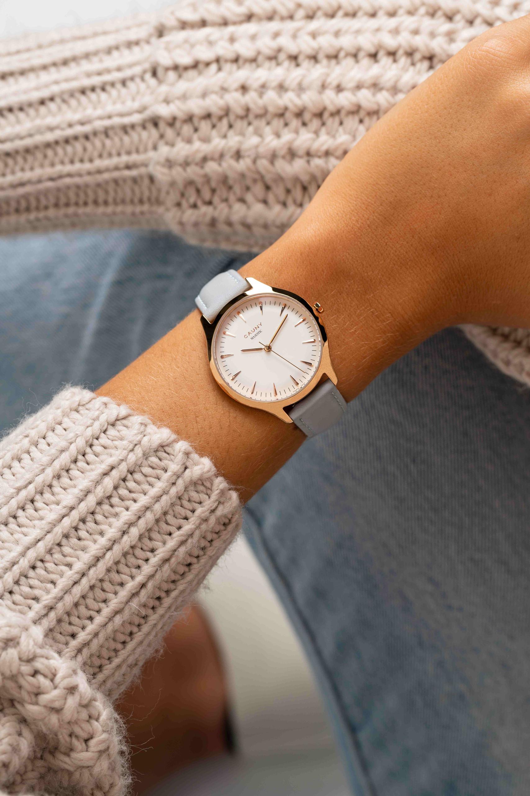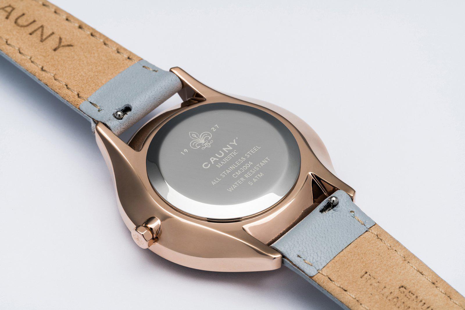 Relógio Cauny de senhora em aço inoxidável com bracelete de pele intercambiável.