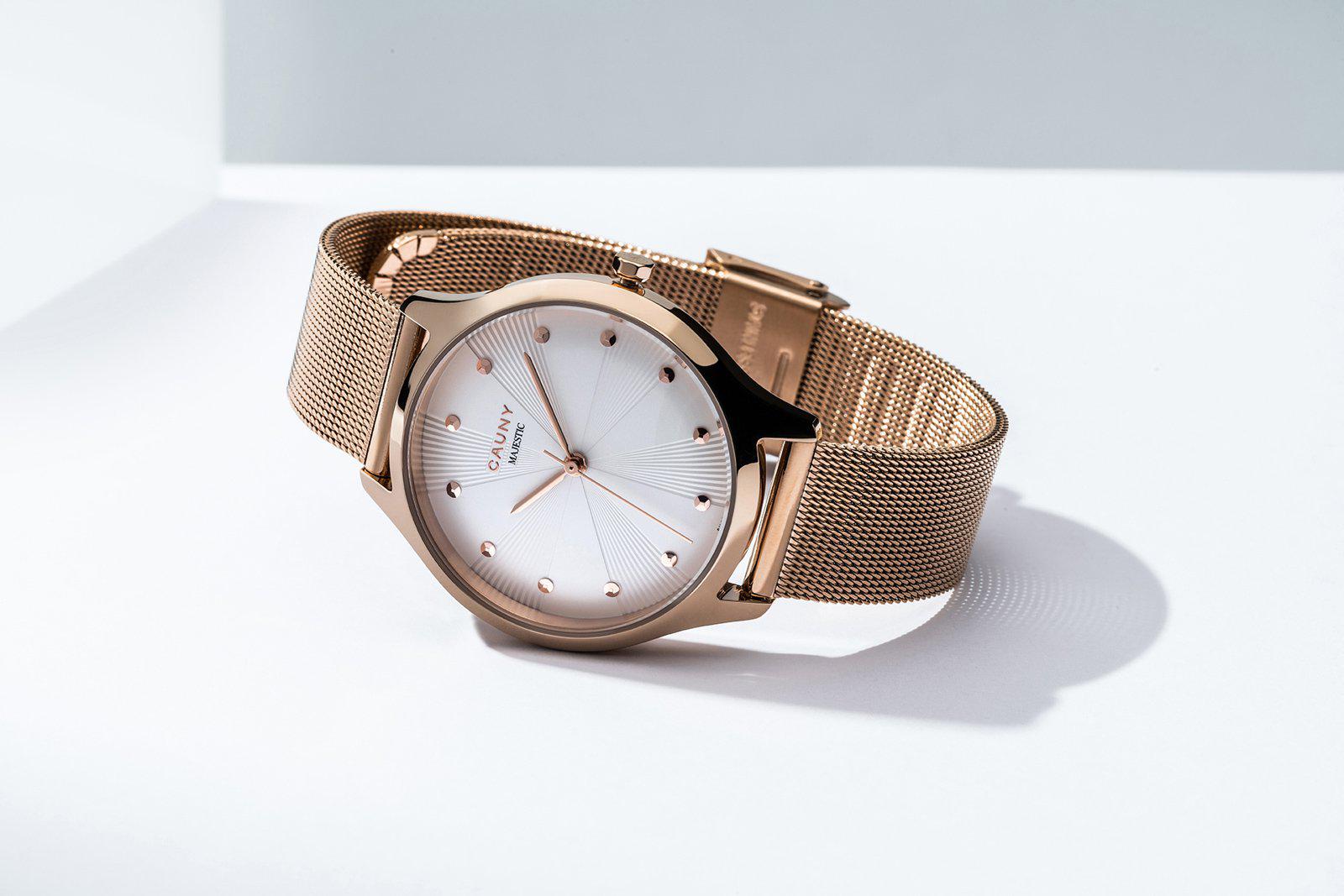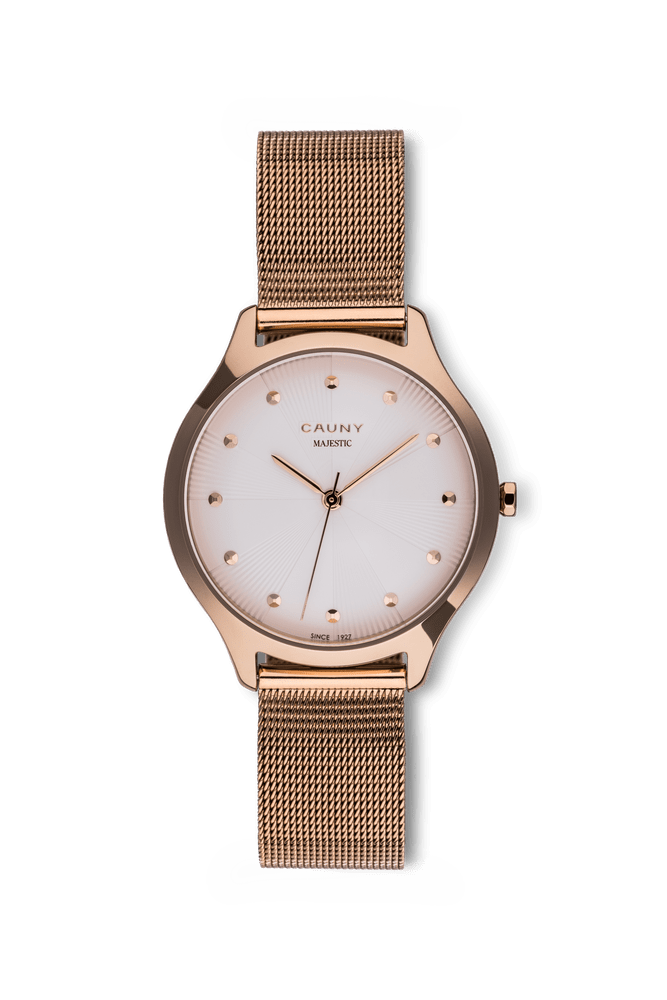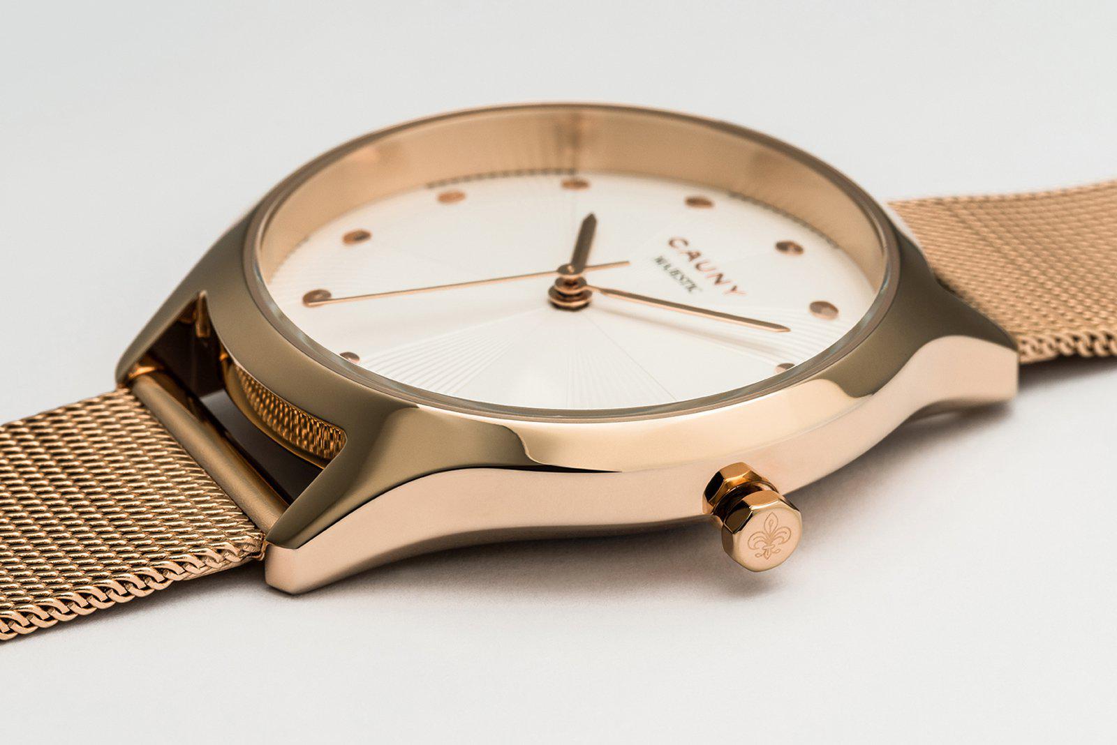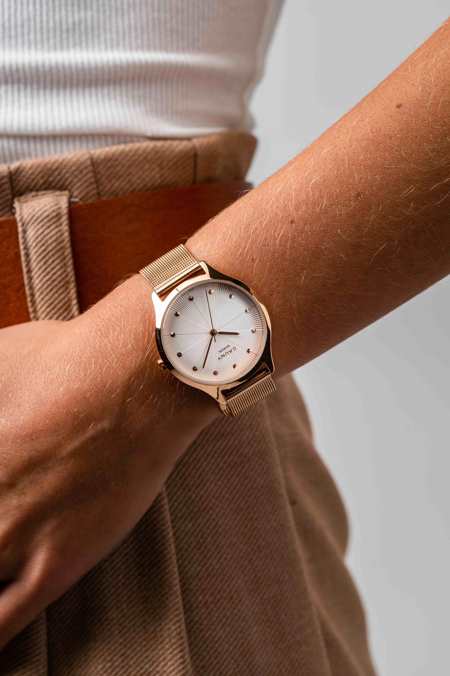 Relógio Cauny de senhora em aço inoxidável com bracelete mesh intercambiável.